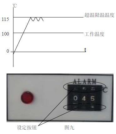 11.2 見圖九,用面板上超溫設(shè)定撥盤的+、— 按鈕進(jìn)行設(shè)定所需限溫溫度。